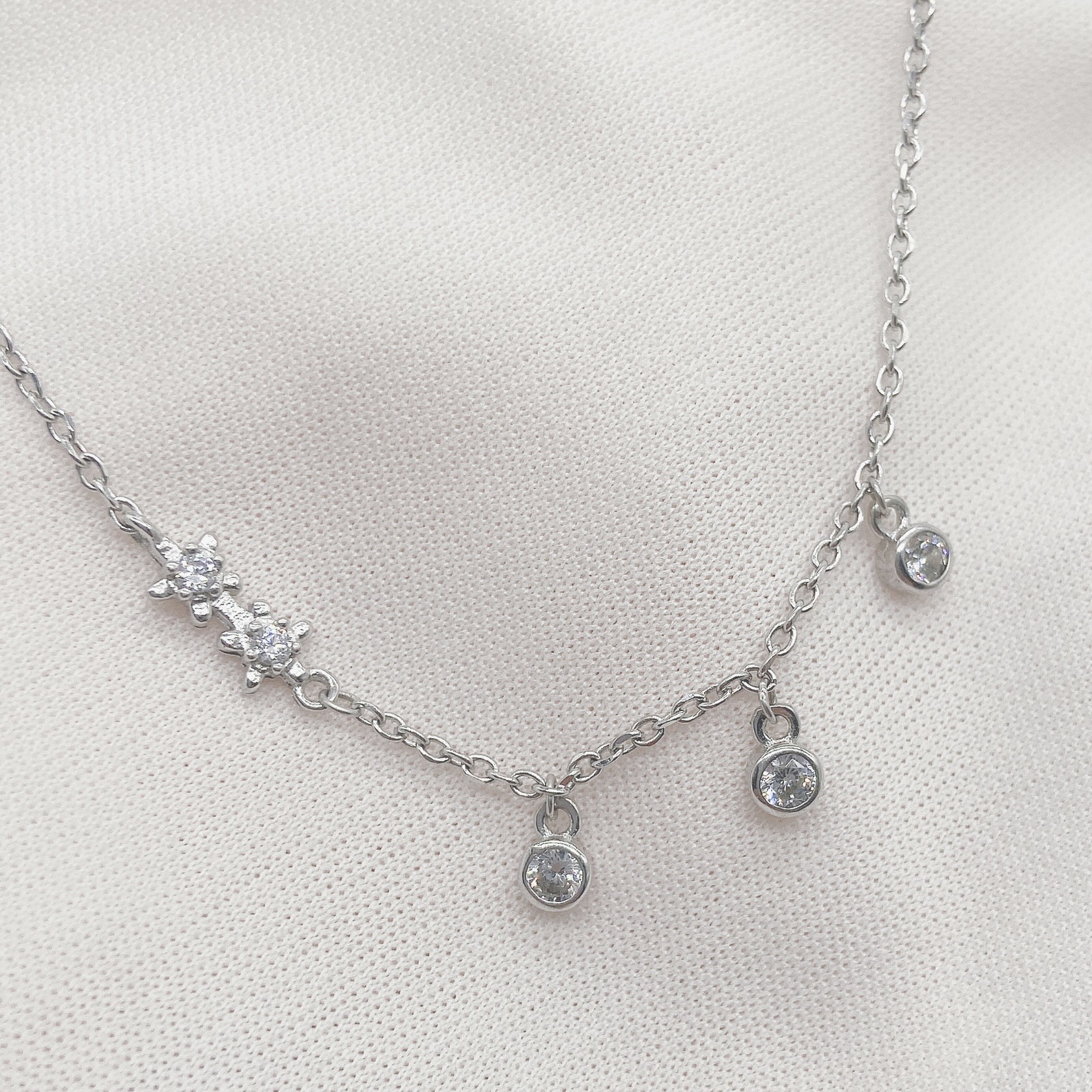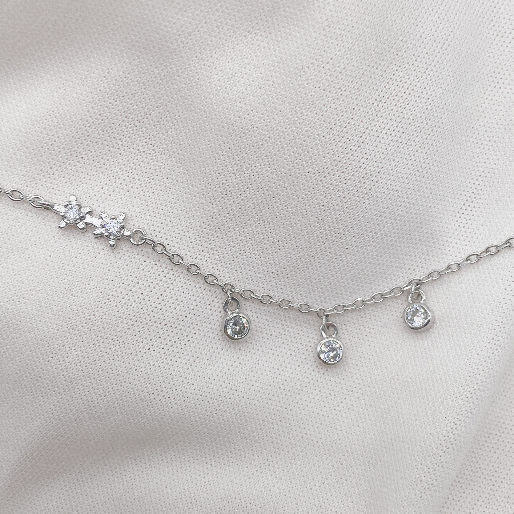Lắc chân hai hoa thả ba viên đá lấp lánh. Những viên đá tỏa sáng ánh kim cương, tạo điểm nhấn cho thiết kế. Một biểu tượng của vẻ đẹp tự nhiên và sự quý phái trong mỗi bước đi.